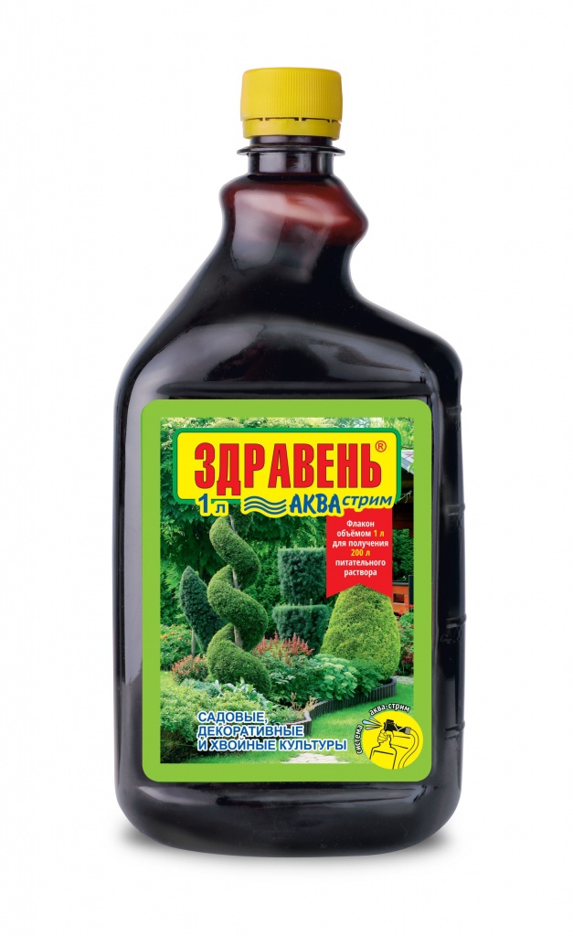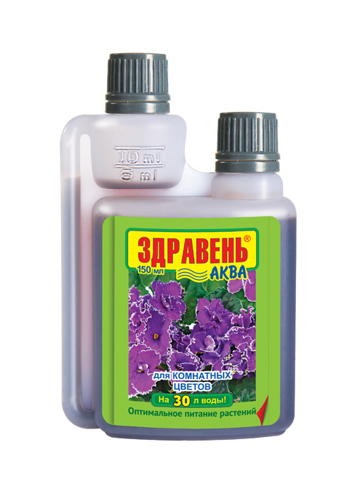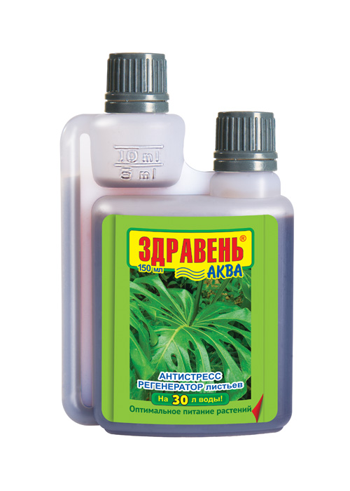 «ЗДРАВЕНЬ-АКВА» — жидкое комплексное органоминеральное удобрение для корневой и некорневой подкормки комнатных цветов в личных подсобных хозяйствах. -увеличивает длительность цветения -обеспечивает полноценное питание -увеличивает количество побегов -стимулирует корневую систему. Массовая доля питательных веществ: N — 4,0%, P — 2,5%, K — 5,0%, Mg — 0,4%, B — 0,006%, Mn — 0,008%, Zn — 0,004%, Cu — 0,005%, Mo — 0,001%, гумат натрия — 0,6%. В форме хелатов: Mn, Zn, Cu. Применение: внекорневые подкормки путём опрыскивания листьев 1 раз в неделю — 10 мл на 3 л воды. Корневые подкормки — 10 мл на 2 л воды.
