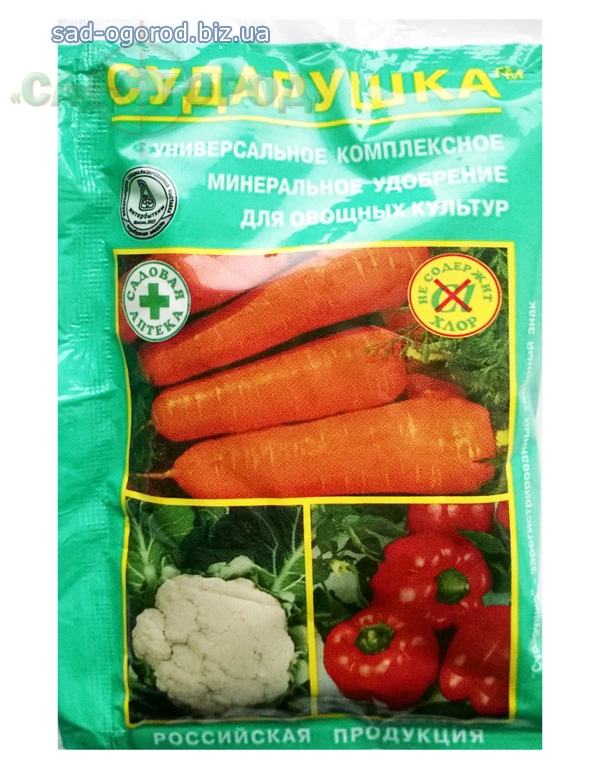 «Сударушка» — удобрение для овощей и зелени, которое содержит комплекс из макро-и микроэлементов, способствующих полноценному формированию культур. Растворяется в воде и не содержит хлора. Состав универсального удобрения: